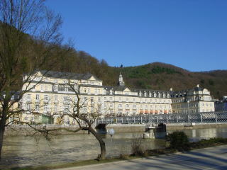 | 2月の晴れ上がった土曜日。小春日和にお出かけ。家から約1時間ほどで、ローマ時代から、温泉聖なる泉がある場所として知られていた、エムスへと、向かう。この町は、LIMES(リーメス)というローマ軍による、西洋版の万里の長城ともいえる、砦の街道(ドイツリーメス街道)が通っている。ローマ帝国の拡大路線は、紀元9年のトイトブルクの森の戦いでローマ軍が大敗した後、ゲルマンの頑強な抵抗にあって押し戻され、ライン河・ドナウ河を境界線としてほぼ勢力が拮抗するにいたる。ローマの軍団はライン左(西)岸とドナウ右(南)岸にいくつもの駐屯地を作って行く。そして、ラインとドナウの間の地域にはリーメスと呼ばれる要塞線を作るのだ。それが通っていた場所のひとつが、BAD EMSだ。別冊温泉の歴史にもあるように、駐屯していたローマの兵士達にとっては、それこそ命綱とも言える飲料水確保の意味合いも兼ねていたに、違いない場所だ。ここに、彼らは飲料可能な温泉(一石二鳥)を発見するのだ。14世紀には森の中に男女混浴の野外の温泉の施設さえも出来上がっていたと言う。 | この野外温泉施設(Wald Bad)は1820年から60年にかけて、一大温泉施設となり、その前(1712/15)には、当時の領主であったナッサウオラニエン家のもと、バロック様式の上記写真のような泉を囲う温泉施設も建てられていく。歴史の中で、この場所が重要な役割を果たしたのは、プロイセンの時代である。ウィルヘルム1世が1867年から1887年まで、毎年ここに逗留していたが、1870年7月13日、ここから、実質的なフランスに対する宣戦布告にあたる、EmserDepesche(エムスの電報)を発信することになる。背景にはスペインの継承問題、(ブルボン家に代わって、ホーエンツオレロン家が候補に上がる)もあった。写真の川べりのプロムナードで、フランス大使ベネデッティが、逗留中のウィルヘルム1世に、この継承を辞退するように迫ったことが発端であった。そして、最終的に近代的なドイツの統一が、ここから発信された電報により開始された、普仏戦争の後、(1870/71) ウィルヘルム1世、とビスマルクのコンビによってなされるのである。 |
