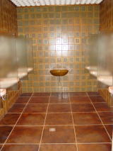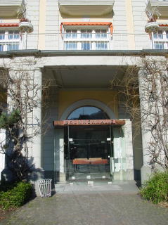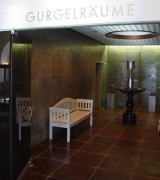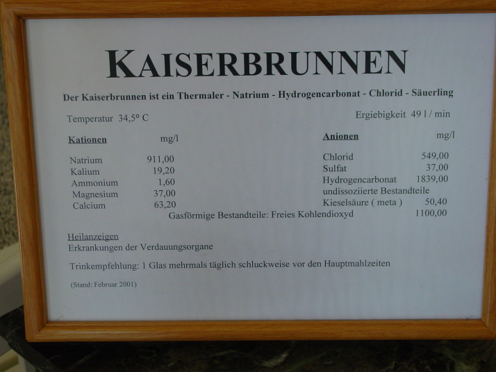 | 最初私は気がつかなかったが、旦那が、わ、こりゃ珍しいと言って、写真をとった場所がここ。温泉といえば、勿論日本では浸かって温まる。こちらでは前項にも出てきたように男女混浴の露天風呂があったけれど、廃れていったのは、伝染病が(チフス、ペスト等)原因と言われ、その後は飲料に依ることが多くなったそうだ。日本では銭湯では、鎖国等の理由から、伝染病に感染することは少なかったのかも知れない。でも、お水、お湯を飲むのは聞いたことがあるが、ここは、うがいとは、、!と、ドイツ人もびっくり!成分表を見てみると、硫黄とか塩素とかが含まれているらしい。これが理由?かなあ。素晴らしい王冠の泉は会館の突き当たりに位置しているが、泉のそばには温泉療養の人たちが座って、ゆっくり新聞を読んだり出来るようにソファーが置かれている。今日も常連さんらしき人たちが静かに新聞を読んでいた。 | ![]() ![]() 左の写真は読みにくいけどうがい室と書かれている |