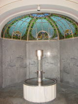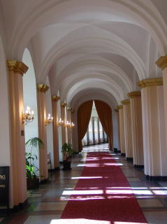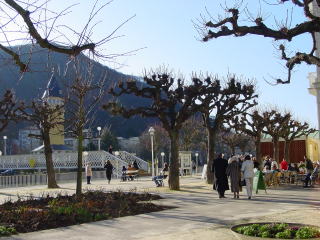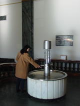 19世紀の温泉全盛時代には沢山の著名人たちが逗留した場所にふさわしく(今はちょっとさびれてるけど、、)ハイソな雰囲気が残る温泉会館内。現在の逗留客のために、音楽会なども行われるようだ。写真の柱の右が小音楽ホールになっている。フレンチカンカン(ムーランルージュ等で演奏された天国と地獄も)の作曲で有名なジャック=オッフェンバッハも11年間(1859−70)ここに住んでいたらしいし、かの、リッヒャルト=ワーグナー(どこでも出没するなあ)も1877にここを訪れた。ロシアのアレキサンダー2世(3世橋はPARISにあるけど、、)6年(1870−76)住んだ。なんと不覚にも、コップを持参し忘れ、なめることしか出来ずに残念至極。お味の方は、甘味のある塩味で、むしろ最初には、あまーい、やわらかーい感覚が舌に残る。 |