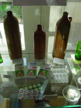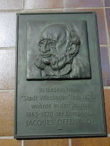 上の写真は成分表です。クリックすると大きくなりますが元に戻るには戻るを使ってください。右の写真は、1800年代に使用されていたエムスのお水のウォーターボトル。約20の源泉からの出水はブランド名を、エムスの王冠と、名づけられて、その当時で、200万トンを越すミネラルウォーターが年間に出荷されたそうだ。1858年からは、喉のくすりとして今も勿論薬局で売っていて、姑が一番良く効くと言っている、喉薬(トローチ)がエムザのパステルンと呼ばれるものだ。(いずれも右側)壁のレリーフの人は、フレンチマンの作曲家ジャック=オッフェンバッハで、彼の6年間住んだ表道リの家に飾られていたもの。残念だが普仏戦争で、フランスに戻ったらしい。(左側) |